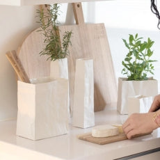 This handcrafted Porcelain Bag Vase is made to look like paper but is made of delicate white porcelain. This item is a perfect companion to the Räder Porcelain Bags. Dimensions: 2.4x2.4x10.2in / 6x6x26cm. Materials: porcelain. Designer: Maike Gerke.